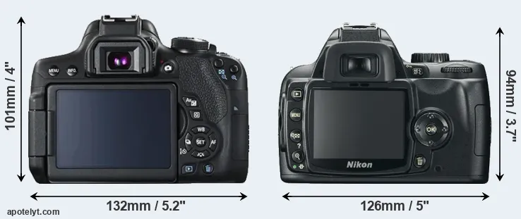 An illustration of the physical size and weight of the Canon T6i and the Nikon D60 is provided in the side-by-side display below. The two cameras are presented according to their relative size. Three successive views from the front, the top, and the rear are shown. All width, height and depth dimensions are rounded to the nearest millimeter.