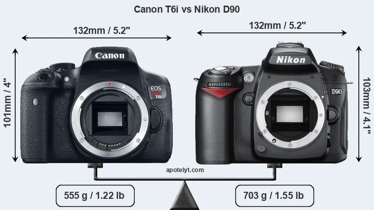 The physical size and weight of the Canon T6i and the Nikon D90 are illustrated in the side-by-side display below. The two cameras are presented according to their relative size. Three consecutive views from the front, the top, and the rear side are shown. All width, height and depth dimensions are rounded to the nearest millimeter.