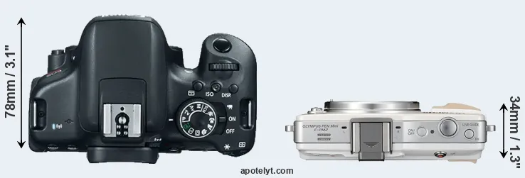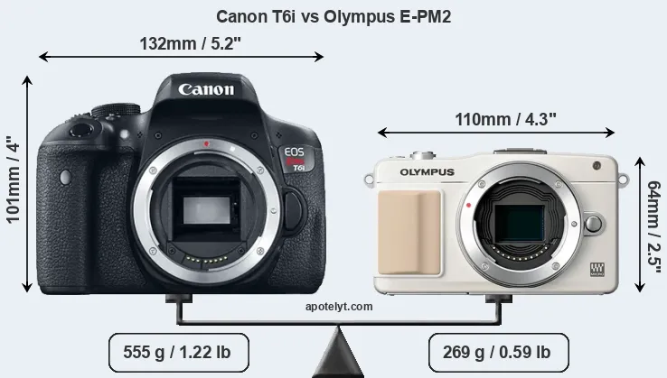The physical size and weight of the Canon T6i and the Olympus E-PM2 are illustrated in the side-by-side display below. The two cameras are presented according to their relative size. Three consecutive perspectives from the front, the top, and the back are available. All width, height and depth dimensions are rounded to the nearest millimeter.
