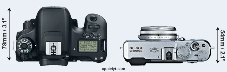 An illustration of the physical size and weight of the Canon T6s and the Fujifilm X100S is provided in the side-by-side display below. The two cameras are presented according to their relative size. Three consecutive perspectives from the front, the top, and the back are available. All size dimensions are rounded to the nearest millimeter.