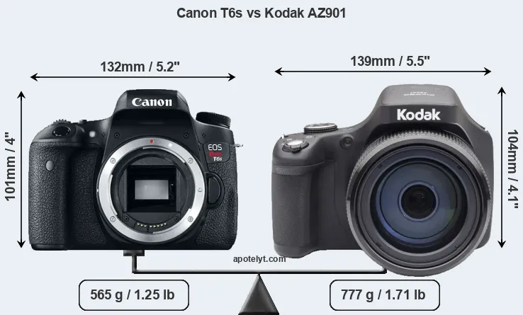 The physical size and weight of the Canon T6s and the Kodak AZ901 are illustrated in the side-by-side display below. The two cameras are presented according to their relative size. Three successive views from the front, the top, and the rear are shown. All width, height and depth dimensions are rounded to the nearest millimeter.