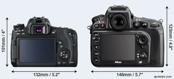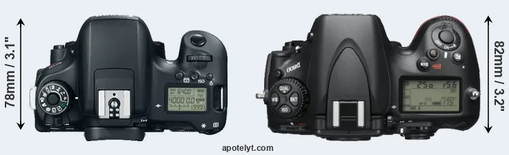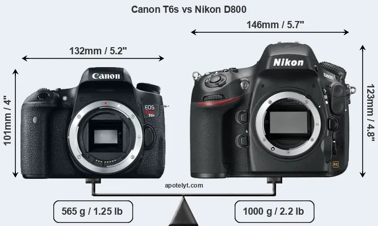 The side-by-side display below illustrates the physical size and weight of the Canon T6s and the Nikon D800. The two cameras are presented according to their relative size. Three consecutive views from the front, the top, and the rear side are shown. All width, height and depth dimensions are rounded to the nearest millimeter.