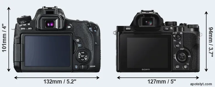 An illustration of the physical size and weight of the Canon T6s and the Sony A7S is provided in the side-by-side display below. The two cameras are presented according to their relative size. Three consecutive views from the front, the top, and the rear side are shown. All width, height and depth measures are rounded to the nearest millimeter.