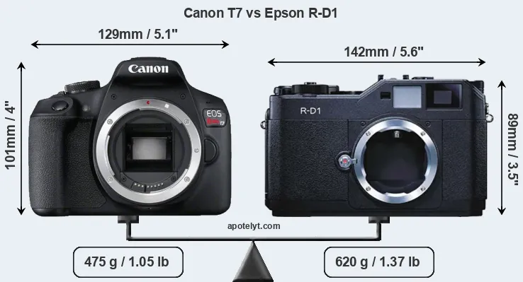 Going beyond this snapshot of core features and characteristics, what are the differences between the Canon EOS Rebel T7 and the Epson R-D1? Which one should you buy? Read on to find out how these two cameras compare with respect to their body size, their imaging sensors, their shooting features, their input-output connections, and their reception by expert reviewers.