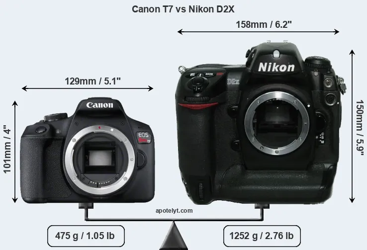 The physical size and weight of the Canon T7 and the Nikon D2X are illustrated in the side-by-side display below. The two cameras are presented according to their relative size. Three successive views from the front, the top, and the rear are shown. All width, height and depth dimensions are rounded to the nearest millimeter.
