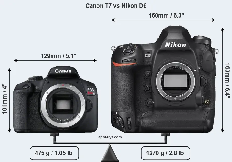 An illustration of the physical size and weight of the Canon T7 and the Nikon D6 is provided in the side-by-side display below. The two cameras are presented according to their relative size. Three successive views from the front, the top, and the rear are shown. All width, height and depth measures are rounded to the nearest millimeter.
