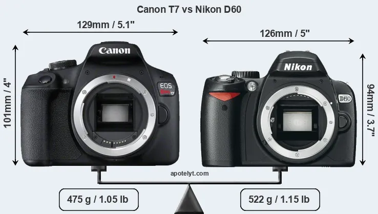 The physical size and weight of the Canon T7 and the Nikon D60 are illustrated in the side-by-side display below. The two cameras are presented according to their relative size. Three consecutive views from the front, the top, and the rear side are shown. All size dimensions are rounded to the nearest millimeter.