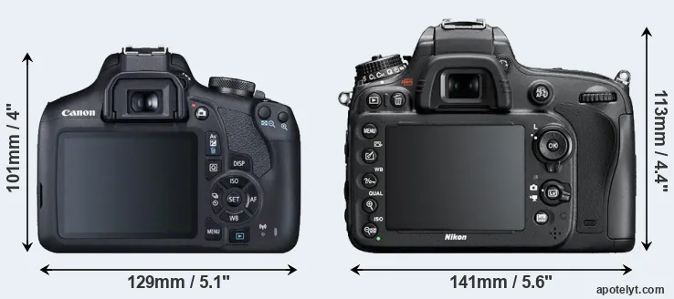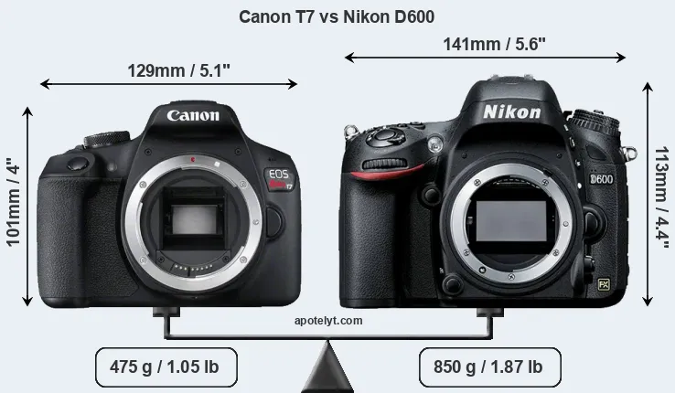 The physical size and weight of the Canon T7 and the Nikon D600 are illustrated in the side-by-side display below. The two cameras are presented according to their relative size. Three consecutive perspectives from the front, the top, and the back are available. All size dimensions are rounded to the nearest millimeter.