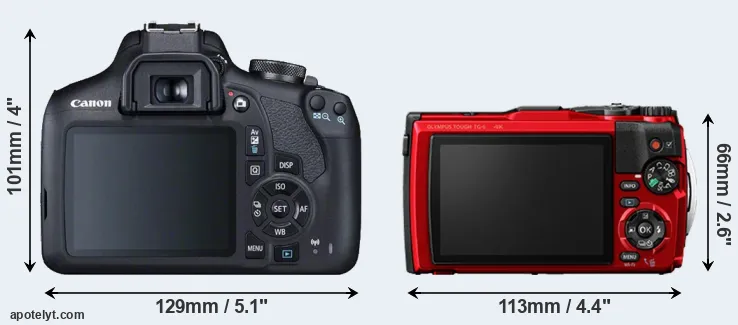 The side-by-side display below illustrates the physical size and weight of the Canon T7 and the Olympus TG-6. The two cameras are presented according to their relative size. Three consecutive perspectives from the front, the top, and the back are available. All width, height and depth measures are rounded to the nearest millimeter.