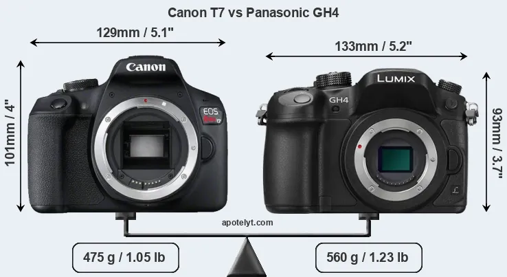 An illustration of the physical size and weight of the Canon T7 and the Panasonic GH4 is provided in the side-by-side display below. The two cameras are presented according to their relative size. Three consecutive perspectives from the front, the top, and the back are available. All width, height and depth dimensions are rounded to the nearest millimeter.