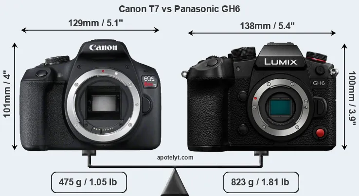An illustration of the physical size and weight of the Canon T7 and the Panasonic GH6 is provided in the side-by-side display below. The two cameras are presented according to their relative size. Three successive views from the front, the top, and the rear are shown. All size dimensions are rounded to the nearest millimeter.