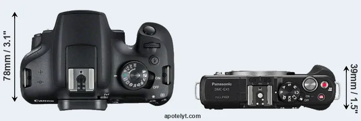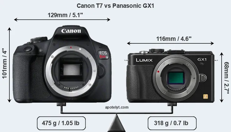 The side-by-side display below illustrates the physical size and weight of the Canon T7 and the Panasonic GX1. The two cameras are presented according to their relative size. Three consecutive perspectives from the front, the top, and the back are available. All width, height and depth measures are rounded to the nearest millimeter.
