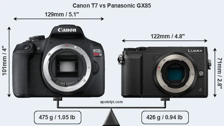 An illustration of the physical size and weight of the Canon T7 and the Panasonic GX85 is provided in the side-by-side display below. The two cameras are presented according to their relative size. Three successive views from the front, the top, and the rear are shown. All size dimensions are rounded to the nearest millimeter.