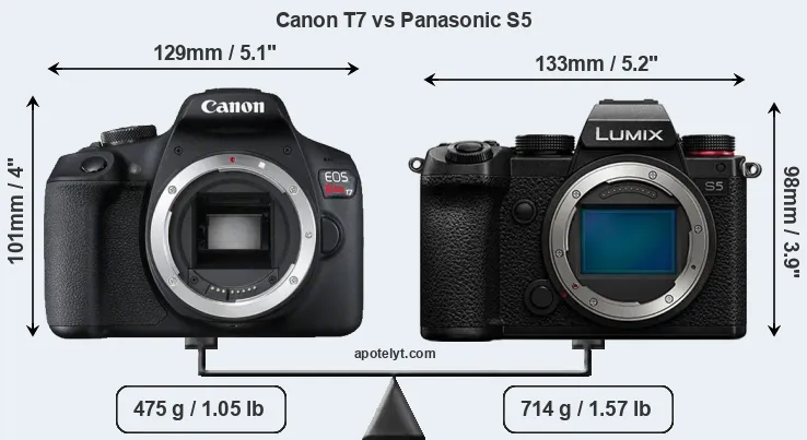 If the front view area (width x height) of the cameras is taken as an aggregate measure of their size, the Canon T7 and the Panasonic S5 are of equal size. However, the S5 is substantially heavier (50 percent) than the T7. It is noteworthy in this context that the S5 is splash and dust-proof, while the T7 does not feature any corresponding weather-sealing.