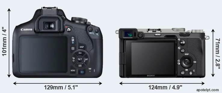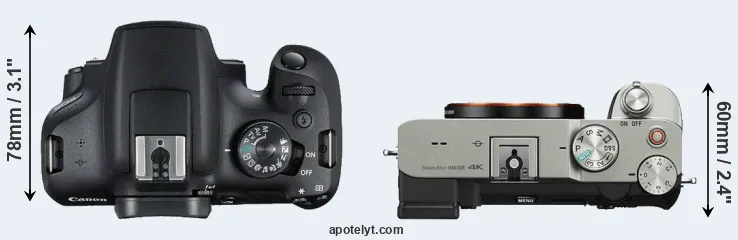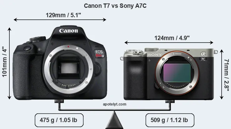 The side-by-side display below illustrates the physical size and weight of the Canon T7 and the Sony A7C. The two cameras are presented according to their relative size. Three consecutive perspectives from the front, the top, and the back are available. All width, height and depth dimensions are rounded to the nearest millimeter.