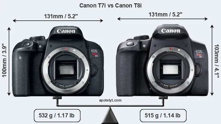 The physical size and weight of the Canon T7i and the Canon T8i are illustrated in the side-by-side display below. The two cameras are presented according to their relative size. Three consecutive perspectives from the front, the top, and the back are available. All width, height and depth measures are rounded to the nearest millimeter.