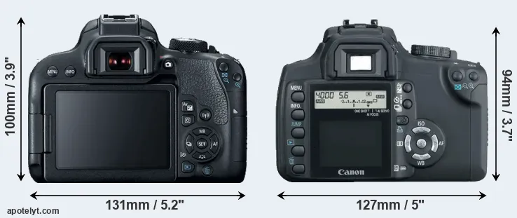 The physical size and weight of the Canon T7i and the Canon XT are illustrated in the side-by-side display below. The two cameras are presented according to their relative size. Three consecutive perspectives from the front, the top, and the back are available. All width, height and depth measures are rounded to the nearest millimeter.