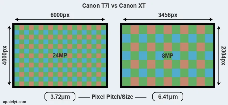 With 24MP, the T7i offers a higher resolution than the XT (8MP), but the T7i has smaller individual pixels (pixel pitch of 3.72μm versus 6.41μm for the XT). However, the T7i is a much more recent model (by 12 years) than the XT, and its sensor will have benefitted from technological advances during this time that enhance the light gathering capacity of its pixels.
