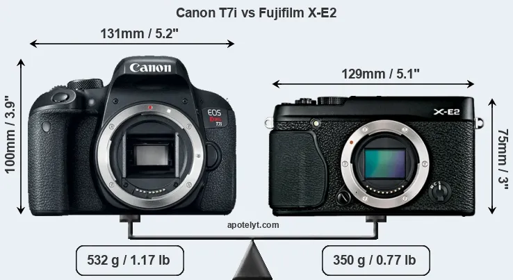 An illustration of the physical size and weight of the Canon T7i and the Fujifilm X-E2 is provided in the side-by-side display below. The two cameras are presented according to their relative size. Three consecutive perspectives from the front, the top, and the back are available. All size dimensions are rounded to the nearest millimeter.