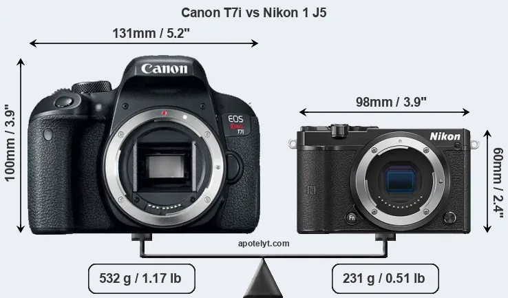 The side-by-side display below illustrates the physical size and weight of the Canon T7i and the Nikon 1 J5. The two cameras are presented according to their relative size. Three consecutive views from the front, the top, and the rear side are shown. All width, height and depth dimensions are rounded to the nearest millimeter.