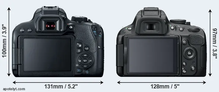 The physical size and weight of the Canon T7i and the Nikon D5100 are illustrated in the side-by-side display below. The two cameras are presented according to their relative size. Three consecutive perspectives from the front, the top, and the back are available. All width, height and depth dimensions are rounded to the nearest millimeter.