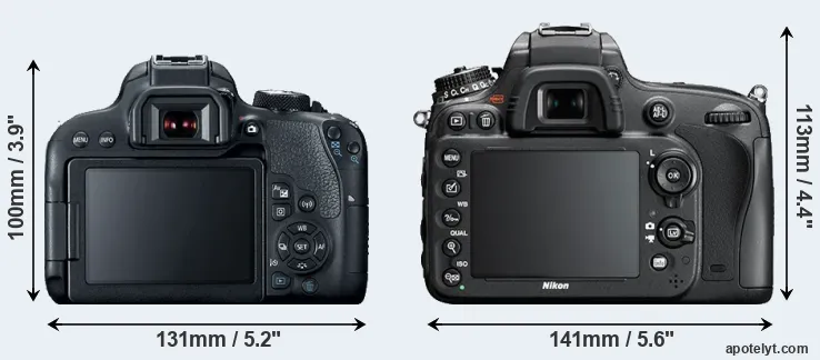 The side-by-side display below illustrates the physical size and weight of the Canon T7i and the Nikon D610. The two cameras are presented according to their relative size. Three consecutive perspectives from the front, the top, and the back are available. All width, height and depth measures are rounded to the nearest millimeter.