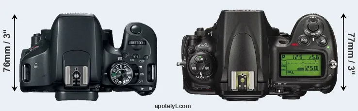The side-by-side display below illustrates the physical size and weight of the Canon T7i and the Nikon D700. The two cameras are presented according to their relative size. Three successive views from the front, the top, and the rear are shown. All width, height and depth measures are rounded to the nearest millimeter.