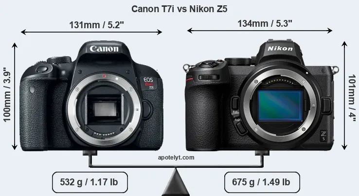 An illustration of the physical size and weight of the Canon T7i and the Nikon Z5 is provided in the side-by-side display below. The two cameras are presented according to their relative size. Three consecutive perspectives from the front, the top, and the back are available. All size dimensions are rounded to the nearest millimeter.