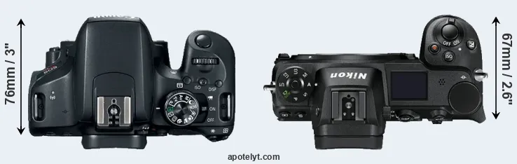 The physical size and weight of the Canon T7i and the Nikon Z7 are illustrated in the side-by-side display below. The two cameras are presented according to their relative size. Three consecutive views from the front, the top, and the rear side are shown. All size dimensions are rounded to the nearest millimeter.