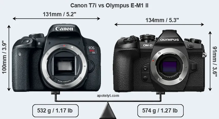 The side-by-side display below illustrates the physical size and weight of the Canon T7i and the Olympus E-M1 II. The two cameras are presented according to their relative size. Three successive views from the front, the top, and the rear are shown. All size dimensions are rounded to the nearest millimeter.
