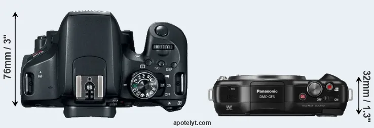 The side-by-side display below illustrates the physical size and weight of the Canon T7i and the Panasonic GF3. The two cameras are presented according to their relative size. Three consecutive views from the front, the top, and the rear side are shown. All size dimensions are rounded to the nearest millimeter.