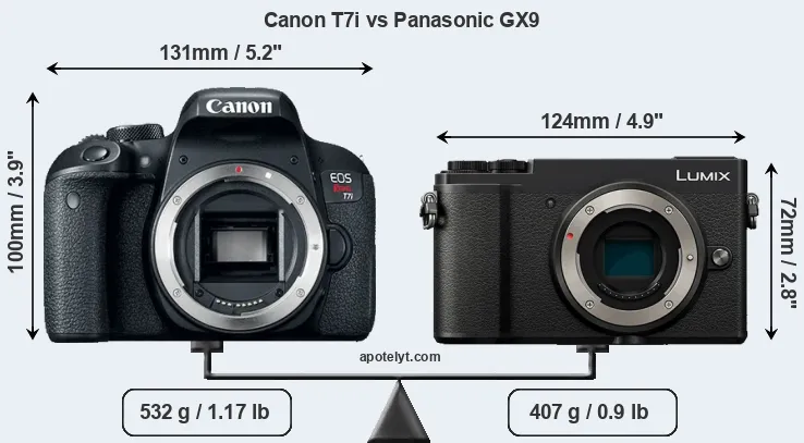 An illustration of the physical size and weight of the Canon T7i and the Panasonic GX9 is provided in the side-by-side display below. The two cameras are presented according to their relative size. Three successive views from the front, the top, and the rear are shown. All width, height and depth dimensions are rounded to the nearest millimeter.