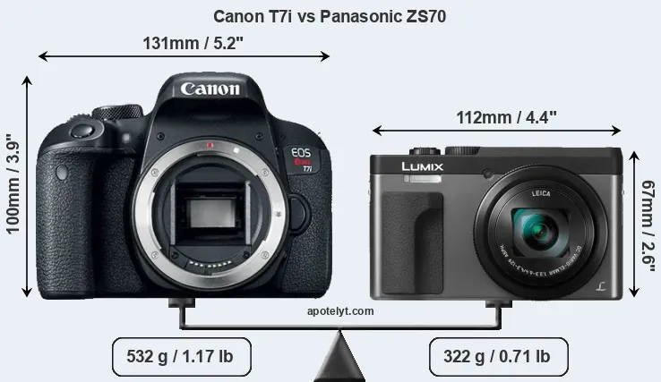 An illustration of the physical size and weight of the Canon T7i and the Panasonic ZS70 is provided in the side-by-side display below. The two cameras are presented according to their relative size. Three consecutive perspectives from the front, the top, and the back are available. All width, height and depth measures are rounded to the nearest millimeter.