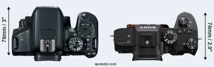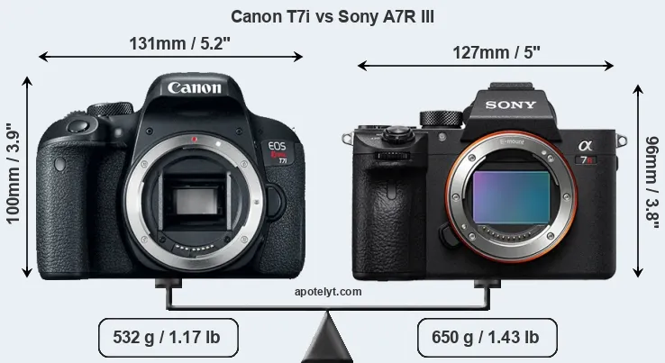 The side-by-side display below illustrates the physical size and weight of the Canon T7i and the Sony A7R III. The two cameras are presented according to their relative size. Three consecutive perspectives from the front, the top, and the back are available. All size dimensions are rounded to the nearest millimeter.