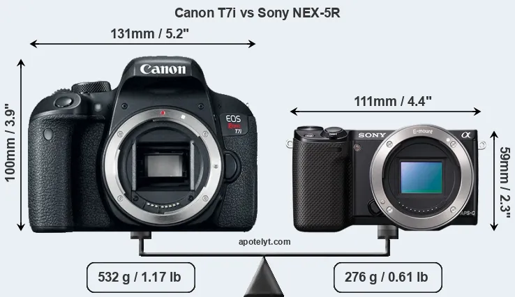 The above size and weight comparisons are to some extent incomplete since they do not consider the interchangeable lenses that both of these cameras require. Both cameras have similarly sized sensors, but DSLRs have a larger flange-to-focal plane distance than mirrorless cameras, which imposes contraints on the optical engineering process and generally leads to bigger and heavier lenses. You can compare the optics available for the two cameras in the Canon EF Lens Catalog (T7i) and the Sony E-Mount Lens Catalog (NEX-5R). Mirrorless cameras, such as the NEX-5R, have moreover the advantage that they can use many lenses from other systems via adapters, as they have a relatively short flange to focal plane distance.
