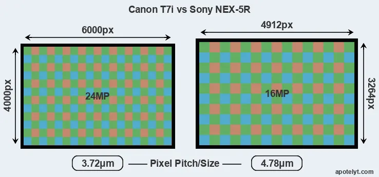 Despite having a smaller sensor, the Canon T7i offers a higher resolution of 24 megapixels, compared with 16 MP of the Sony NEX-5R. This megapixels advantage comes at the cost of a higher pixel density and a smaller size of the individual pixel (with a pixel pitch of 3.72μm versus 4.78μm for the NEX-5R). However, it should be noted that the T7i is much more recent (by 4 years and 5 months) than the NEX-5R, and its sensor will have benefitted from technological advances during this time that make it possible to gather light more efficiently.