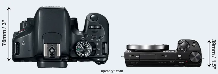 An illustration of the physical size and weight of the Canon T7i and the Sony NEX-5R is provided in the side-by-side display below. The two cameras are presented according to their relative size. Three consecutive views from the front, the top, and the rear side are shown. All width, height and depth measures are rounded to the nearest millimeter.