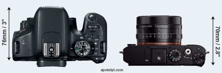 The side-by-side display below illustrates the physical size and weight of the Canon T7i and the Sony RX1R. The two cameras are presented according to their relative size. Three successive views from the front, the top, and the rear are shown. All size dimensions are rounded to the nearest millimeter.