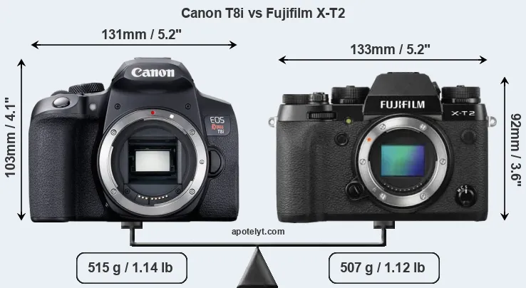 The above size and weight comparisons are to some extent incomplete since they do not consider the interchangeable lenses that both of these cameras require. Both cameras have similarly sized sensors, but DSLRs have a larger flange-to-focal plane distance than mirrorless cameras, which imposes contraints on the optical engineering process and generally leads to bigger and heavier lenses. You can compare the optics available for the two cameras in the Canon EF Lens Catalog (T8i) and the Fujinon X Lens Catalog (X-T2). Mirrorless cameras, such as the X-T2, have moreover the advantage that they can use many lenses from other systems via adapters, as they have a relatively short flange to focal plane distance.