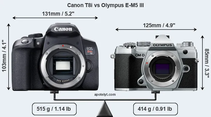 The physical size and weight of the Canon T8i and the Olympus E-M5 III are illustrated in the side-by-side display below. The two cameras are presented according to their relative size. Three consecutive perspectives from the front, the top, and the back are available. All width, height and depth dimensions are rounded to the nearest millimeter.