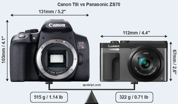 The physical size and weight of the Canon T8i and the Panasonic ZS70 are illustrated in the side-by-side display below. The two cameras are presented according to their relative size. Three consecutive perspectives from the front, the top, and the back are available. All width, height and depth dimensions are rounded to the nearest millimeter.
