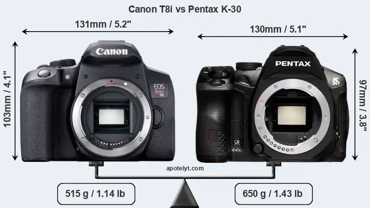 If the front view area (width x height) of the cameras is taken as an aggregate measure of their size, the Pentax K-30 is notably smaller (7 percent) than the Canon T8i. However, the K-30 is markedly heavier (26 percent) than the T8i. It is noteworthy in this context that the K-30 is splash and dust-proof, while the T8i does not feature any corresponding weather-sealing.