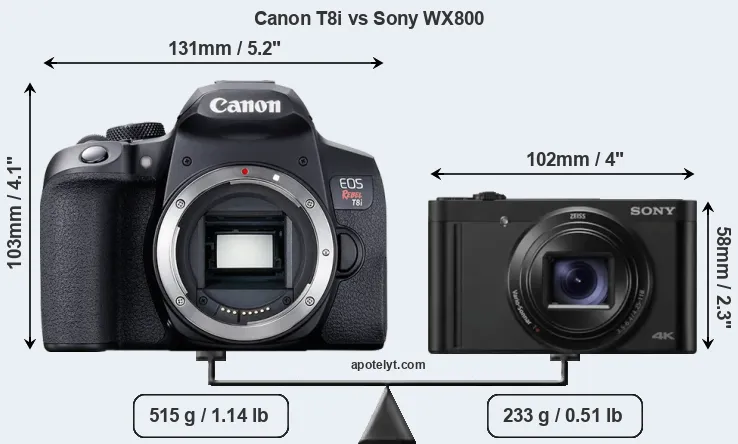 The physical size and weight of the Canon T8i and the Sony WX800 are illustrated in the side-by-side display below. The two cameras are presented according to their relative size. Three consecutive perspectives from the front, the top, and the back are available. All width, height and depth dimensions are rounded to the nearest millimeter.