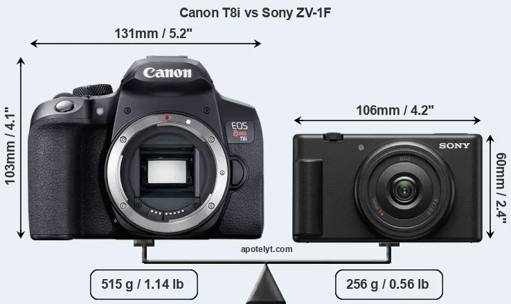 The above size and weight comparisons are to some extent incomplete and possibly misleading, as the ZV-1F has a lens built in, whereas the T8i is an interchangeable lens camera that requires a separate lens. Attaching the latter will add extra weight and bulk to the setup. You can compare the optics available for the T8i and their specifications in the Canon EF Lens Catalog.