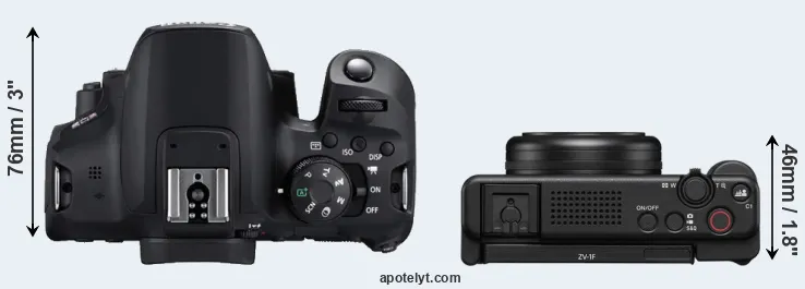 The physical size and weight of the Canon T8i and the Sony ZV-1F are illustrated in the side-by-side display below. The two cameras are presented according to their relative size. Three consecutive views from the front, the top, and the rear side are shown. All width, height and depth dimensions are rounded to the nearest millimeter.
