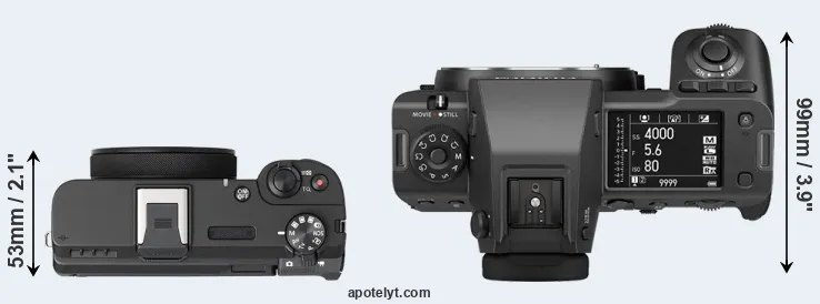 The physical size and weight of the Canon V1 and the Fujifilm GFX 100 II are illustrated in the side-by-side display below. The two cameras are presented according to their relative size. Three consecutive views from the front, the top, and the rear side are shown. All size dimensions are rounded to the nearest millimeter.