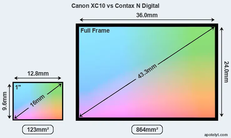 Of the two cameras under consideration, the Canon XC10 features an one-inch sensor and the Contax N Digital a full frame sensor. The sensor area in the N Digital is 602 percent bigger. As a result of these sensor size differences, the cameras have a format factor of, respectively, 2.75 and 1.0. The sensor in the XC10 has a native 4:3 aspect ratio, while the one in the N Digital offers a 3:2 aspect.