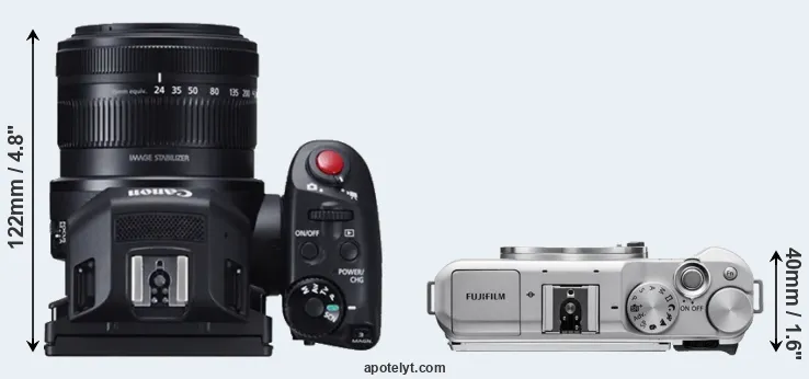 An illustration of the physical size and weight of the Canon XC10 and the Fujifilm X-A5 is provided in the side-by-side display below. The two cameras are presented according to their relative size. Three consecutive perspectives from the front, the top, and the back are available. All size dimensions are rounded to the nearest millimeter.