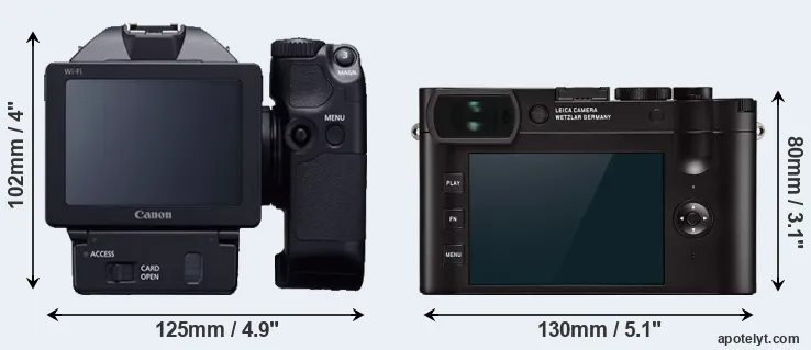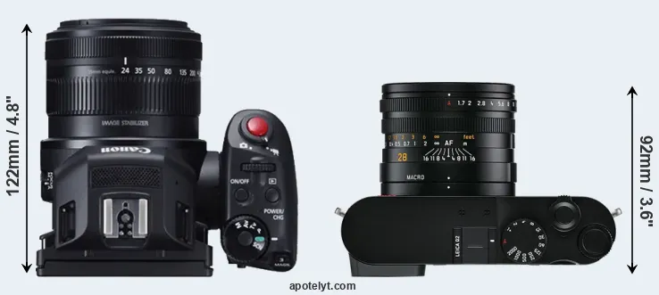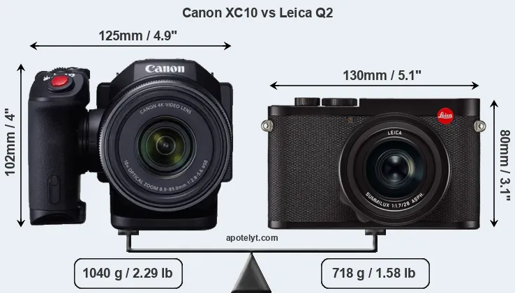 The physical size and weight of the Canon XC10 and the Leica Q2 are illustrated in the side-by-side display below. The two cameras are presented according to their relative size. Three consecutive views from the front, the top, and the rear side are shown. All size dimensions are rounded to the nearest millimeter.