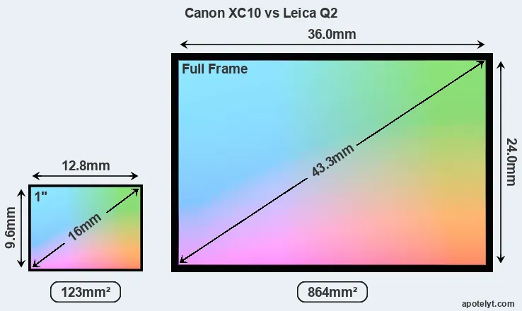 Of the two cameras under consideration, the Canon XC10 features an one-inch sensor and the Leica Q2 a full frame sensor. The sensor area in the Q2 is 602 percent bigger. As a result of these sensor size differences, the cameras have a format factor of, respectively, 2.75 and 1.0. The sensor in the XC10 has a native 4:3 aspect ratio, while the one in the Q2 offers a 3:2 aspect.